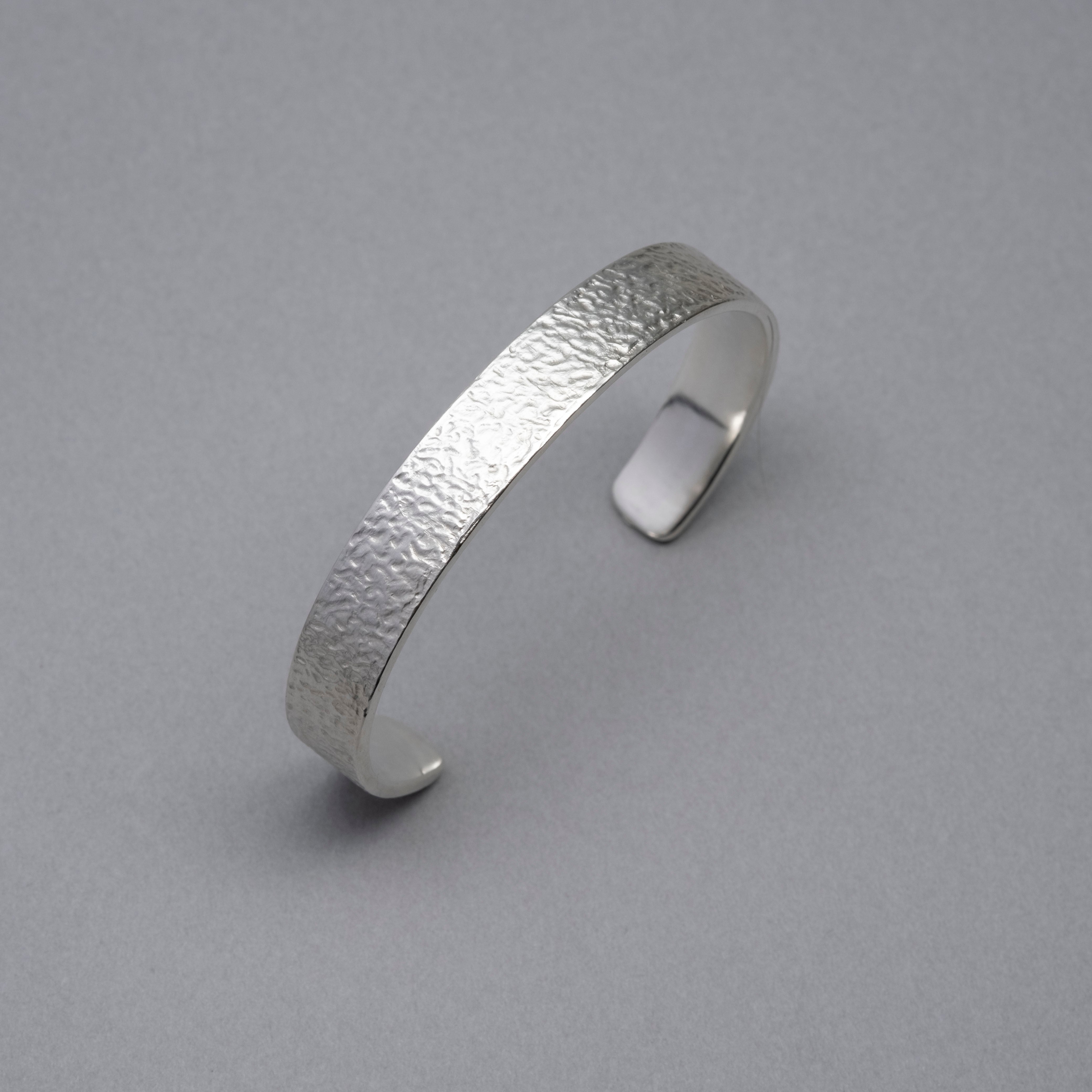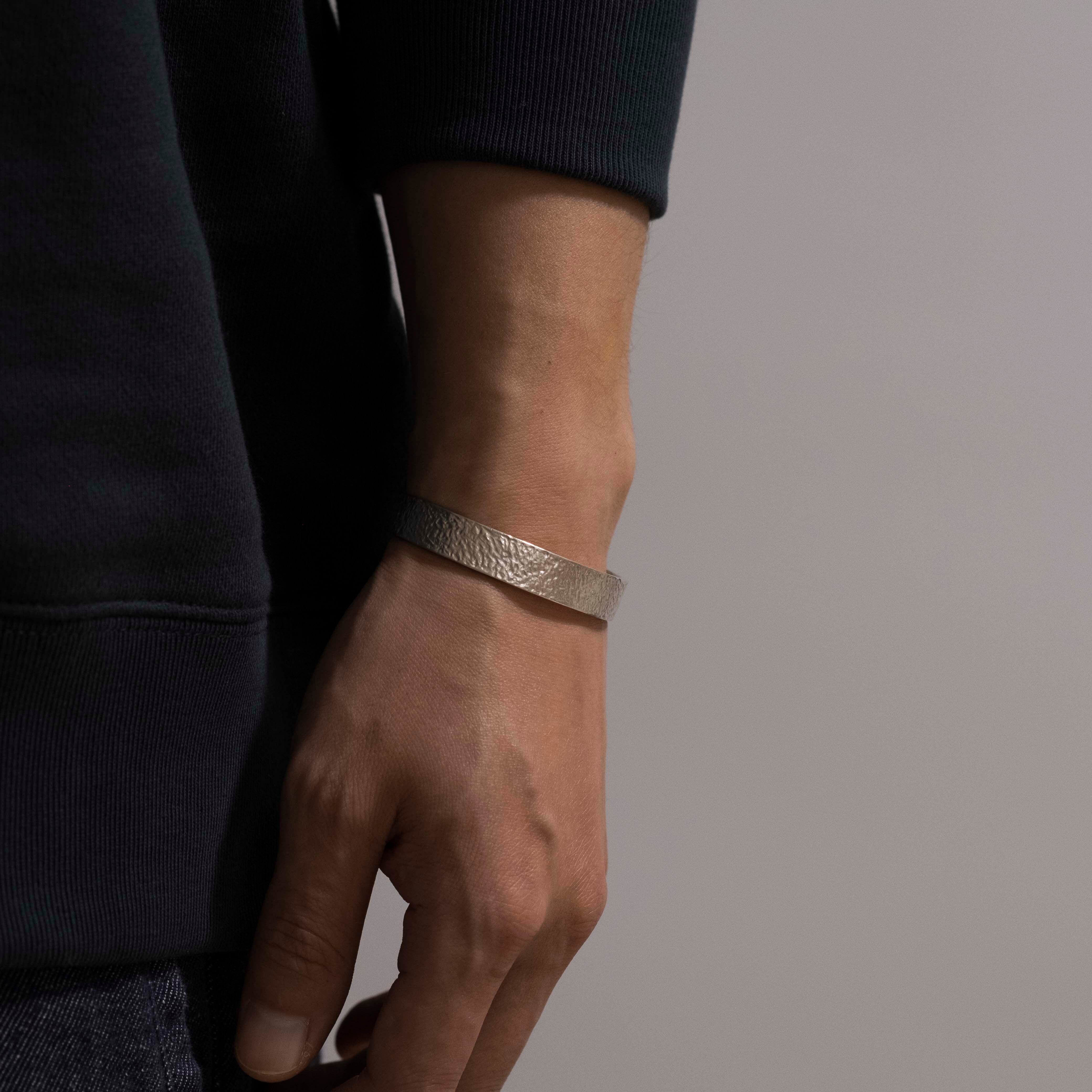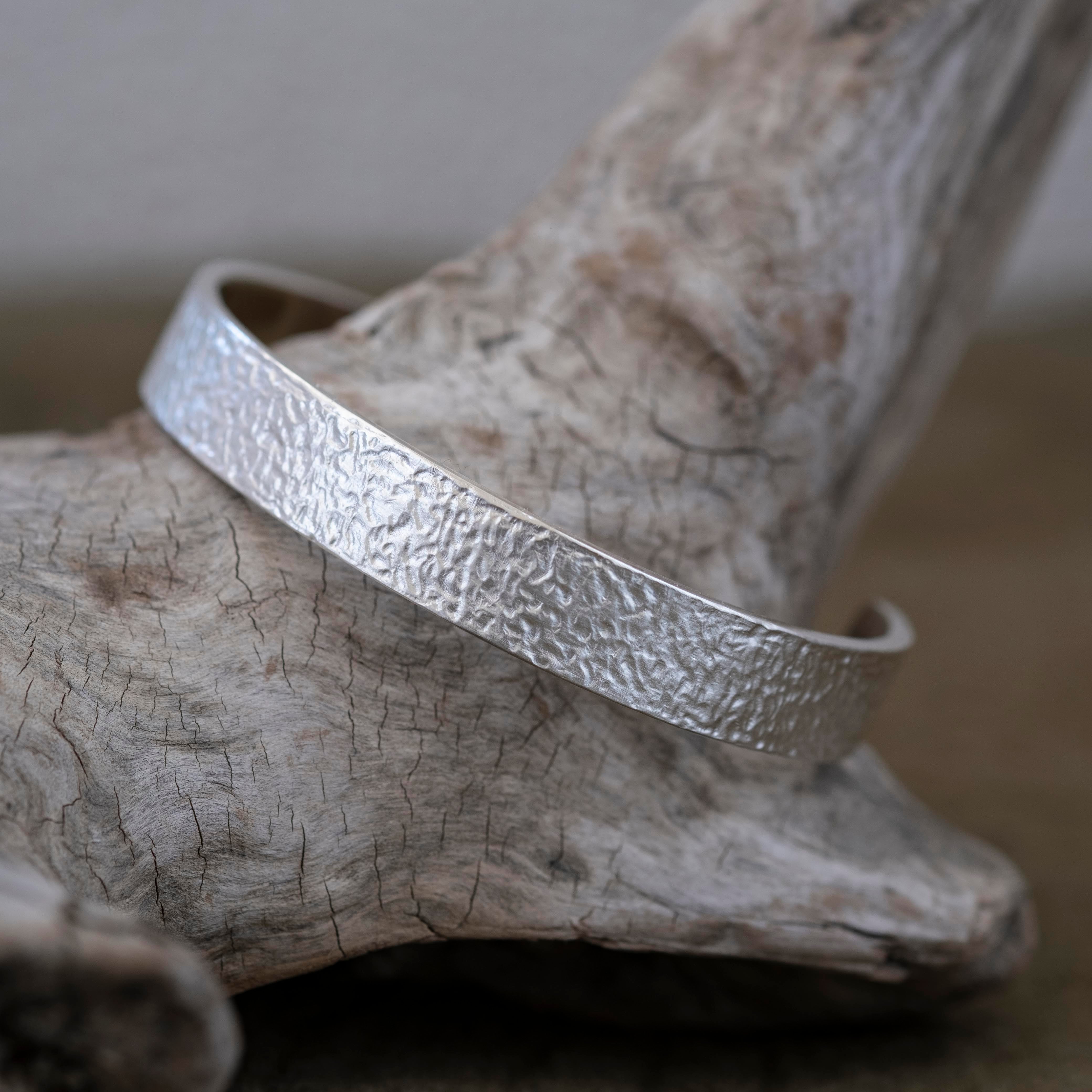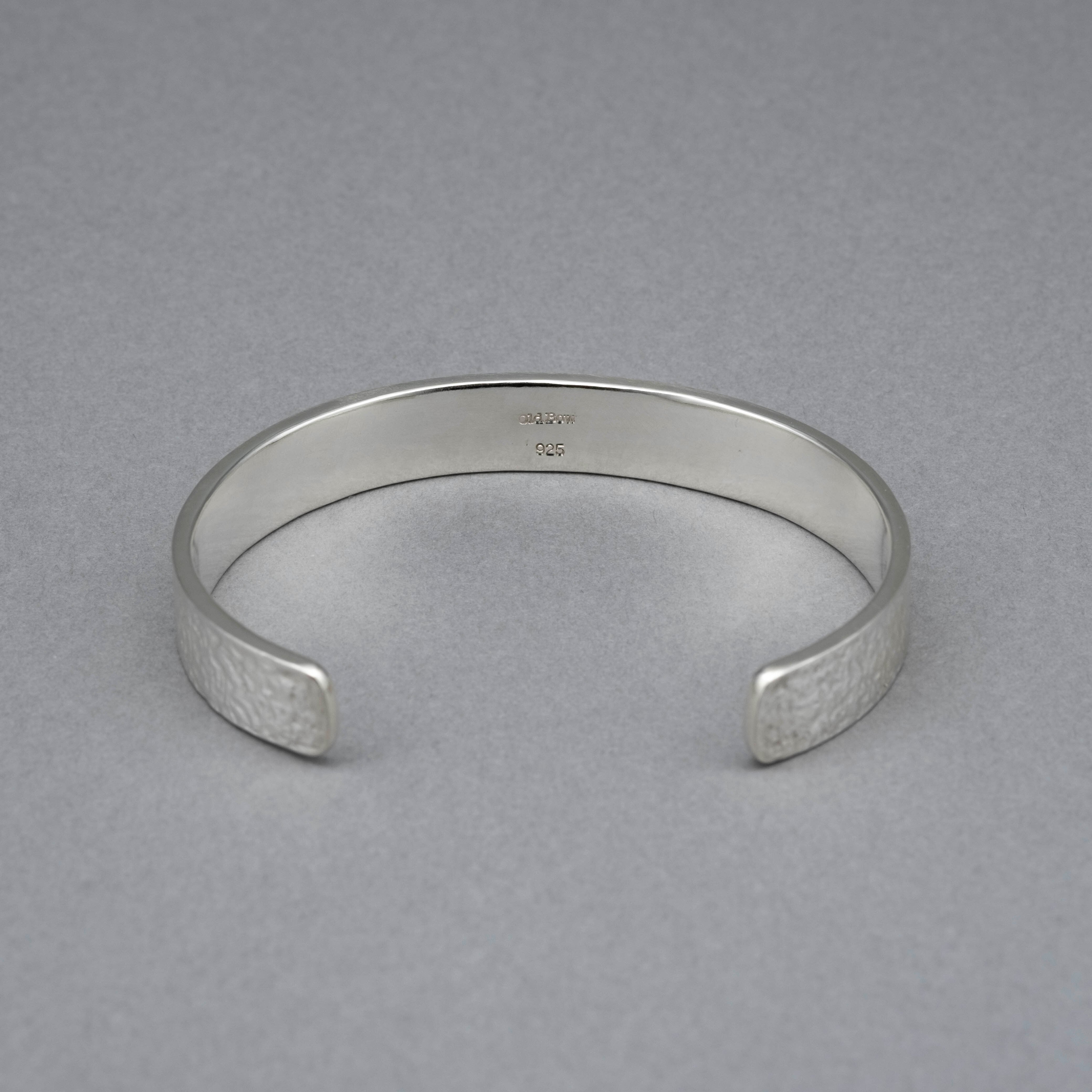 和紙モチーフのバングルです。和紙の模様がある表側はマット仕上げになっております。和紙模様にマット仕上げをすることで、おぼろげな輝きになり主張しすぎずいろいろな服装にあわせられるバングルになっております。鏡面部分もオリジナルのアンティーク仕上げにすることで光すぎずに落ち着いた輝きになっています。